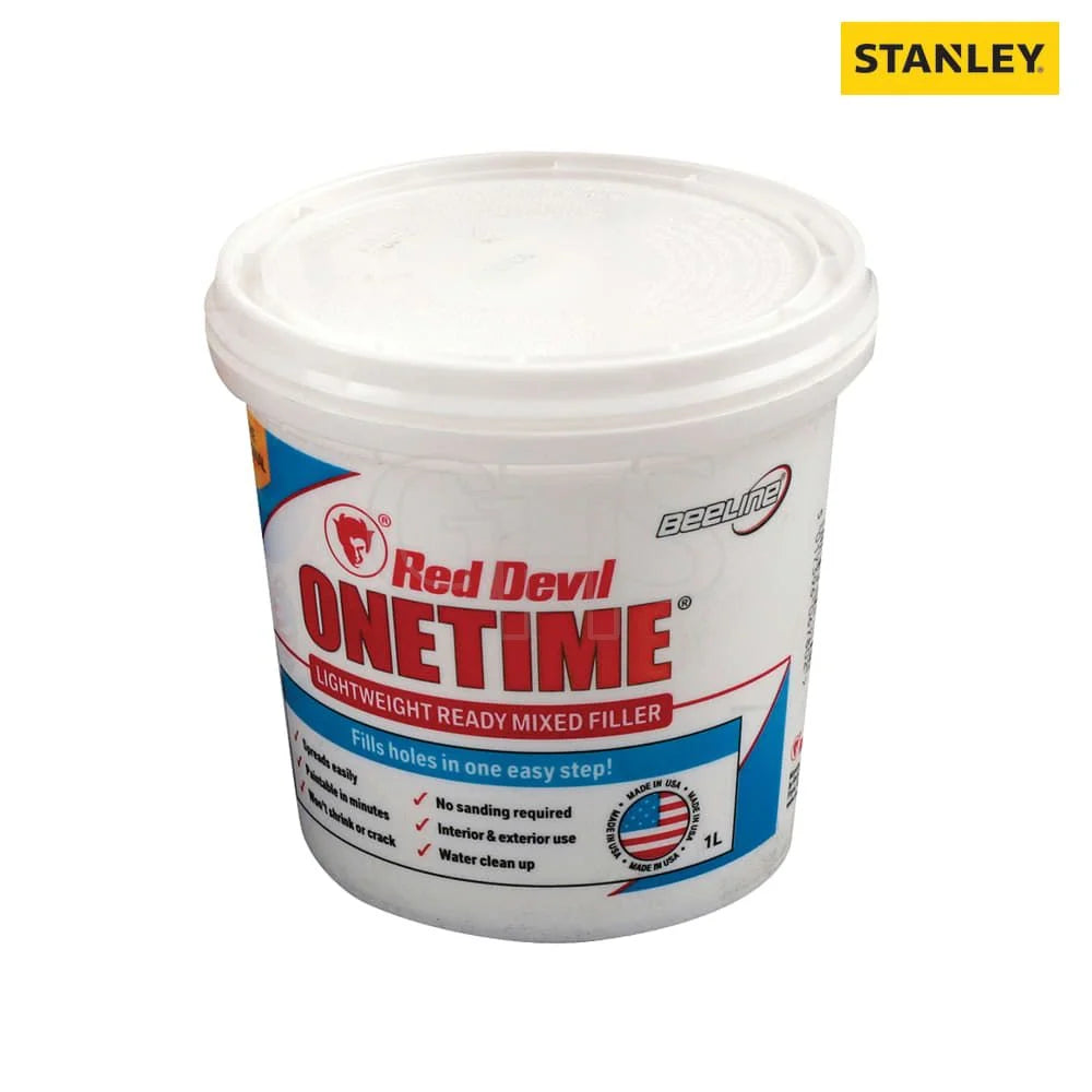 Red Devil Onetime Filler is a specially formulated, premium, lightweight filler which comes ready mixed. It spreads easily, is paintable within minutes and won't shrink or crack. No sanding is required.
