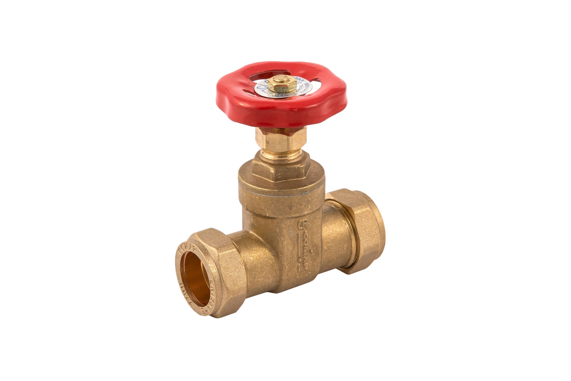Material: Brass Size: 15mm Colour: Brass / red handle WRAS approved 15mm brass Gate Valve with red handle - non BS. Supplied with pre-loaded olives in compression nuts.Suitable for hot and cold domestic water systems.