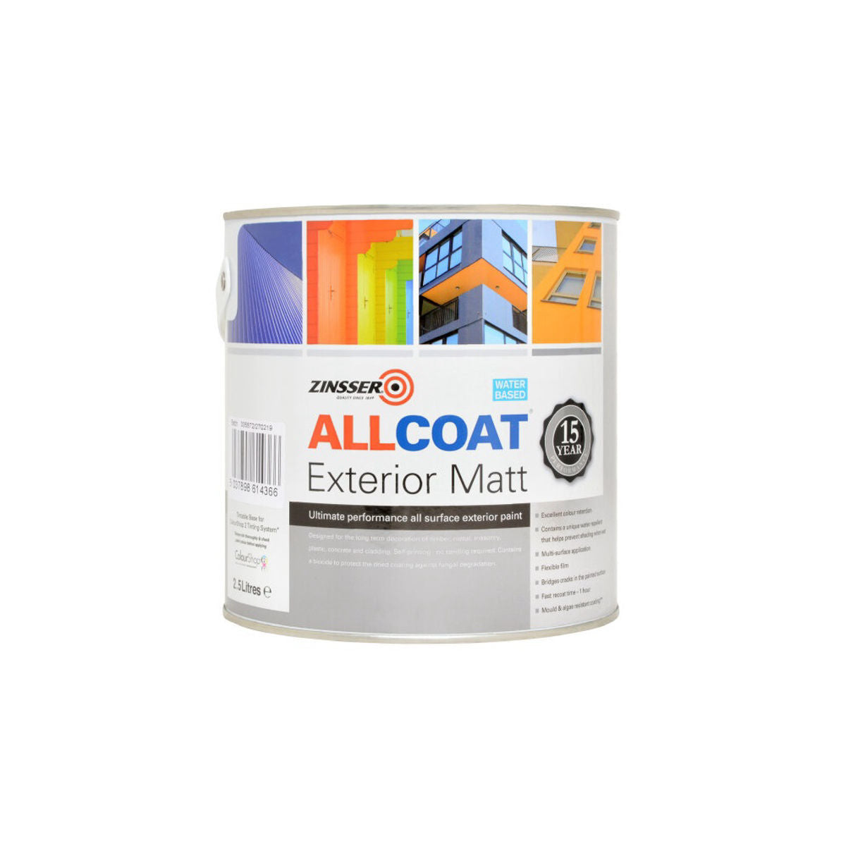 Zinsser Allcoat Exterior Matt is a high performance exterior paint suitable for a wide range of surfaces including timber, metal, masonry, plastic, concrete, cladding, UVPC and more. Designed to be a long lasting durable paint, it forms a breathable, low maintenance, water-shedding coating that is touch dry and ready for recoat in just one hour.