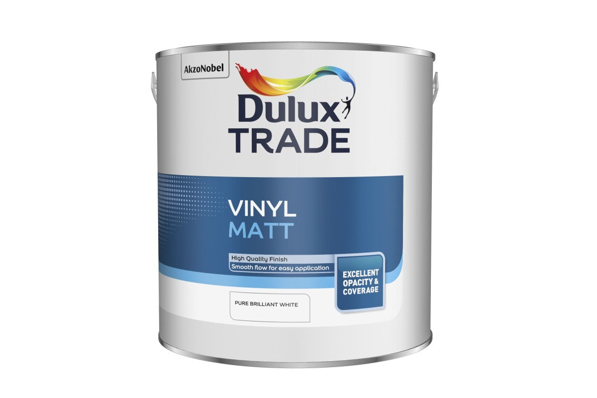 Dulux Trade Vinyl Matt Pure Brilliant White 2.5L is a top quality, high opacity emulsion which gives excellent coverage with a high-quality finish. Dulux Trade Vinyl Matt has a smooth flow for easy application. Suitable for all normal interior wall and ceiling surfaces.