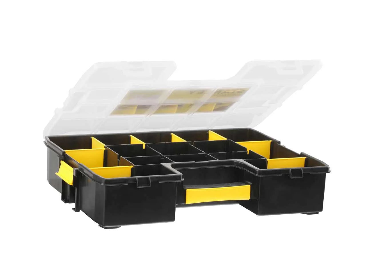 The Stanley stackable Sortmaster junior offers a great deal of storage flexibility. Removable dividers allow a combination of tools and small parts storage. It has a special lid structure where the upper ribs interlock with inner dividers keeping small parts in place and preventing movement from one compartment to another.