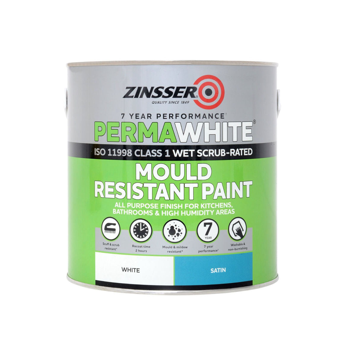 PermaWhite White Interior Satin is a mould resistant interior paint, containing a biocode that protects the dried coating against fungal degradation. The paint film is designed to resist cracking, peeling and blistering for up to 7 years before first maintenance. PermaWhite bonds to existing solvent-based or glossy paints and can also seal new drywall, cement block and concrete. A scrubbable, satin finish recommended for any area of persistent high humidity, frequent temperature changes and poor air circulation - ideal for bathrooms and laundry rooms.